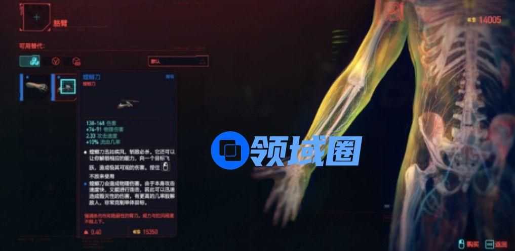 需要注意的是,螳螂刀并不算在武器分类,而是安装在手臂的义体。因此在武器店你是无法购买的,需要去义体医生那里进行购买与装备。