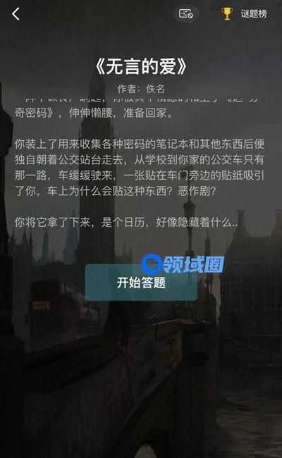 犯罪大师无言的爱答案大全。新的谜题已经推出,在这里你将施展出自己前所未有的推理能力,对于每一位侦探用户而言,面对新的挑战一定要足够的冷静,不要自乱阵脚,发现有利线索才能揭开真相谜团。下面就为大家带来犯罪大师无言的爱答案大全。