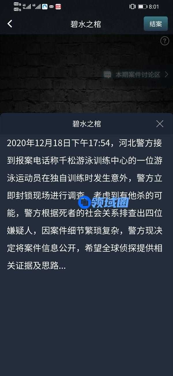2020年12月18日下午17:54,河北警方接到报案电话称千松游泳训练中心的一位游泳运动员在独自训练时发生意外,警方立即封锁现场进行调查。考虑到有他杀的可能,警方根据死者的社会关系排查出四位嫌疑人,因案件细节繁琐复杂,警方现决定将案件信息公开,