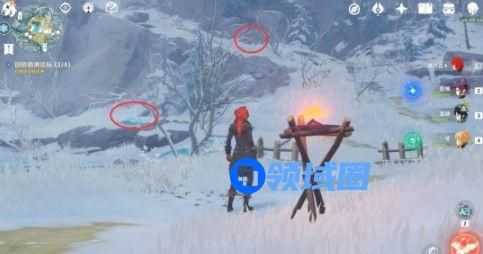 第二个在一个雪堆下面,用元素视野看一下一目了然,用火元素攻击消融积雪回收信标。