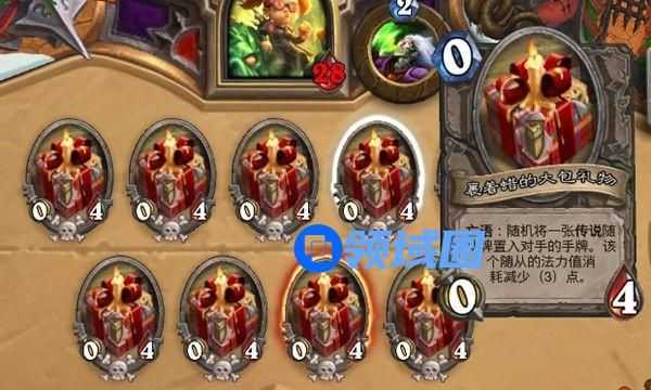 对局开始时双方场上都会有四个大包礼物:“亡语:随机将一张传说随从牌置入对手的手牌。该随从的法力值消耗减少(3)点。”