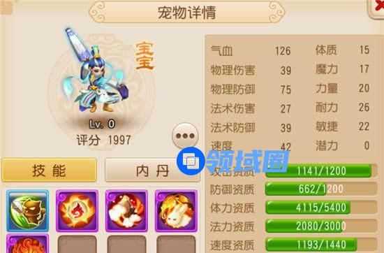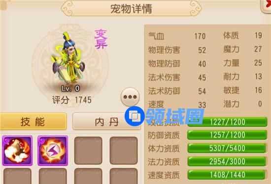 这个变异宝宝的评分为1745,有水漫金山、高级雷属性吸收两个技能,没有内丹。成长不错,不过离1.3的满成长还有点距离,法资和体资离满资质也有距离,不过总体来说这个变异宝宝是中规中矩,可以通过打书成为平民常用的宝宝。