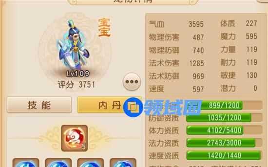 这个宝宝评分是1677,有高级雷属性吸收、高级土属性吸收、水漫金山、突进四个技能,没有内丹,成长只有1.159,明显是用吸血鬼合出来的,最终还是会用来做合宠胚子。