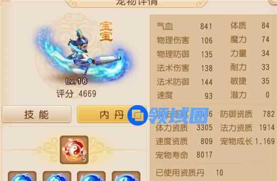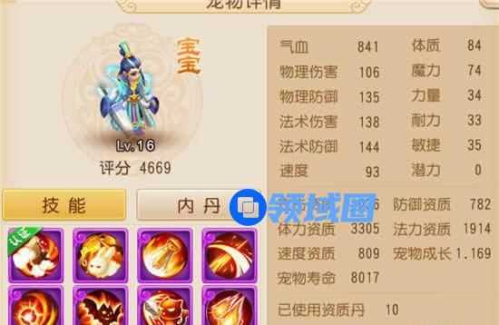 此宝宝评分为4669,有11个技能,分别为:水漫金山(已认证)、高级神佑复生、高级必杀、高级突进、高级法术波动、高级吸血、高级偷袭、高 级法术连击、高级法术爆击、高级魔之心、高级连击;成长较低,法资和体资也偏低,法宠红书缺高会心。说明此宝宝是一个评分宠,在实际的pk场合作用不是很大。