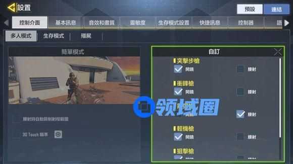 游戏拥有两种基本操作设置,通常大家都会选择进阶模式,进阶模式拥有更细致的准心设置,可针对不同枪械采用特定的瞄准调整,具体如下:除霰弹枪之外,其他全部选择开镜
