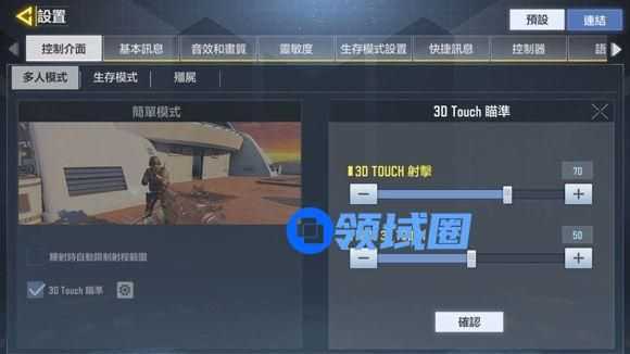 这个是苹果设备的福音,对于拥有3D触控的iphone或ipad来说,该设置下手指不用离开屏幕,就可以切换瞄准和开火状态,在屏幕上轻轻滑动来移动视角瞄准,再施加力度即可射击,具体力度可根据个人习惯在设置里微调,可以参照大神70和50的设置。