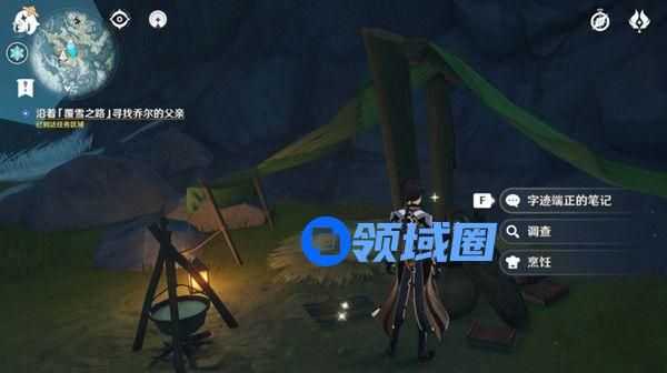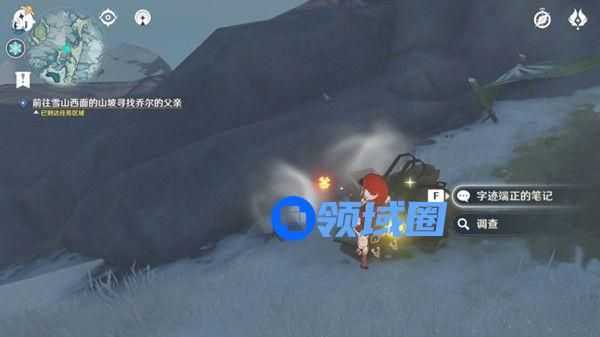 在到达任务区域后,我们可以看到雪堆下隐约露出堆积着的行李,通过火元素攻击融化掉雪堆后(普通雪堆,不需要深赤之石buff),同样是一本字迹端正的笔记。