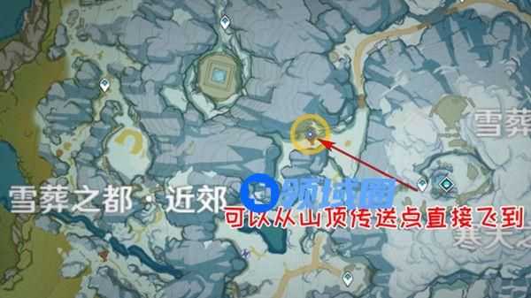 循着小地图的指引,我们来到雪山西面的山坡,前进路线如图所示,可以直接从雪山山顶的传送点飞到。尚未解锁山顶的小伙伴可以从其他位置绕路过来,追踪任务有明显的黄色光柱提示。