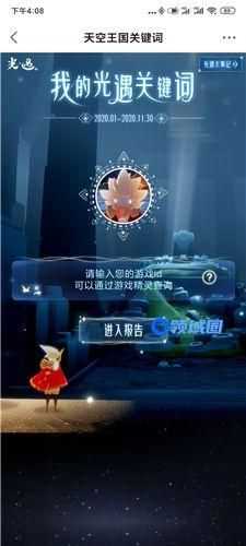 光遇2020个人年度报告怎么看?想要查询报告,你首先得输入关键词后,系统才会为你陈列一系列的事件出来,但很多人却不知道该输入什么关键词进去,使自己废了很长的时间也没能顺利的看到自己想要的结果。下面就为大家带来光遇2020个人年度报告查看攻略。