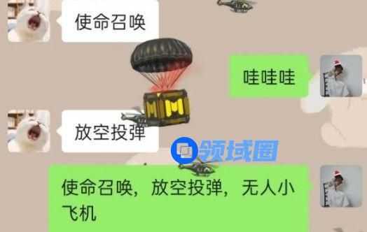 可以复制并在微信中发送如下的口令:使命召唤,放空投弹,无人小飞机。然后就能够看到聊天界面会像下图中这样出现有直升机和空投补给的表情掉落,还是很有趣的。