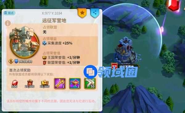 占领后能够获得采集速度+25%,王国荣誉值及联盟荣誉值+1/分钟的增益。
