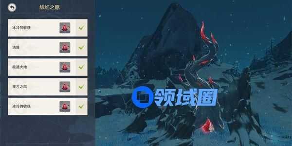 实际上,绯红之愿是玩家们将忍冬之树供奉到8级之后开启的全新玩法,将会在雪山地图上刷新出5个点位的任务,玩家们前往点位后完成挑战或者杀敌任务即可。