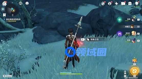 前两处深赤之石都有屏障保护,需分别击败三个自律守护机关与一只丘丘霜铠王才可击破。第三处较为隐蔽,从霜铠王所在的地方向高处攀登,可以看见一个风元素方碑,激活后穿过风场即可到达深赤之石所在地。