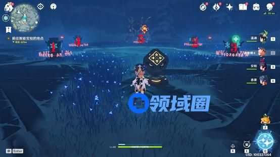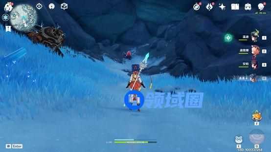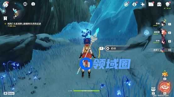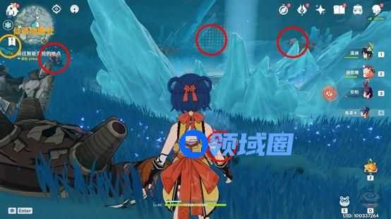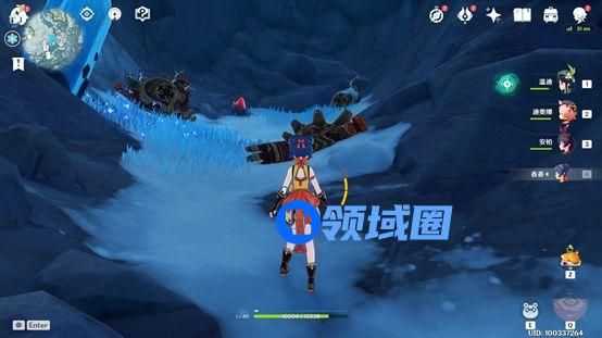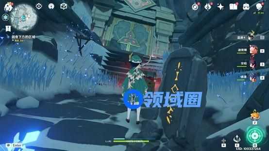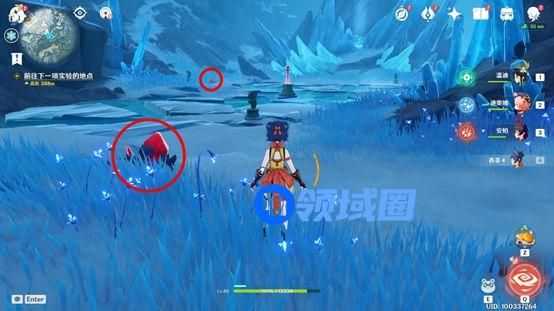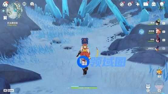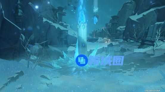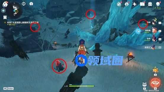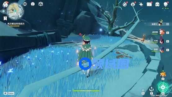 中央的红石在栅栏后,需要找到两个仙灵归位才能开启。其中一个在坚冰高处,较为明显,另一个隐藏在图中的雪堆处,用火元素攻击融化雪堆即可使仙灵归位。
