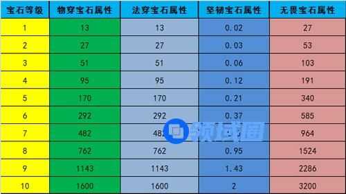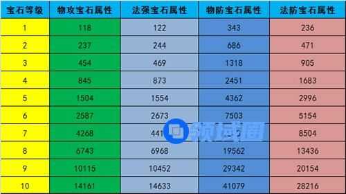 游戏中所有宝石从1级至10级共分为10个等级。其中红色宝石暗属性可以分为:物攻、法强、物防、法防四种。
