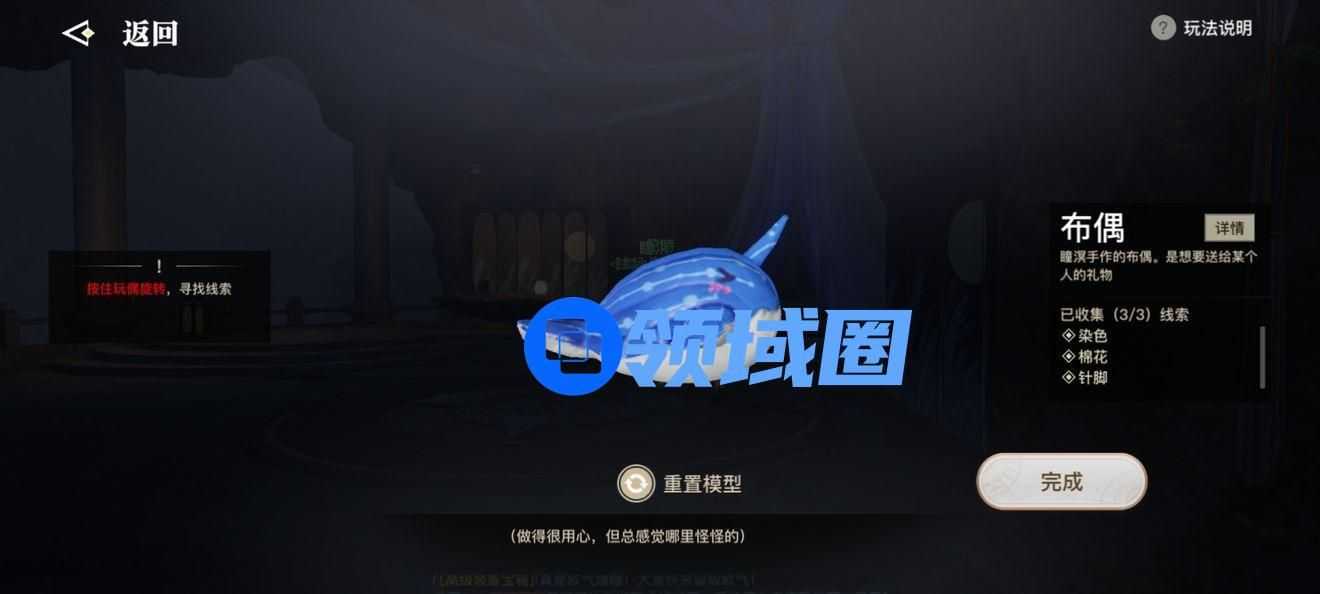 4.然后会触发瞳溟秘密的礼物,需要查看瞳溟手作的布偶,然后我们就会得到一个布偶,点击查看,我们可以看出来做的非常用心,我们需要欣赏一下,观察布偶的三个地方,染色,棉花和针脚,观察完毕就可以了。
