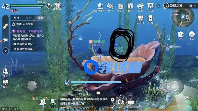 6、再回去绿藻花园传送点,往图里面右上角那个位置游,在花园中间那个大贝壳上面,游过去对话拍照。