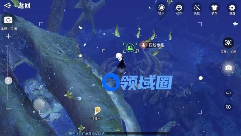 像这样,找不到就打开相机,冲着标记游过去,过去之后靠近拍照点那个小相机就会触发,不用瞎找