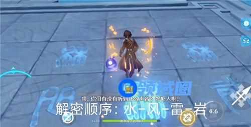 首先解密的顺序为:水→风→雷→岩,记住各个传送门前的这个元素符号,比如水符号就是这样的。