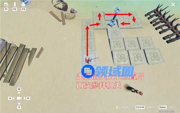 终于可以开始走格子解谜了,先走到箭头终点处,接着与参拜机关再次交互即可出现消失的格子。