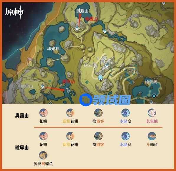 奥藏山的鱼有:花鱂、甜甜花鱂、擒霞客、水晶宴、长生仙。