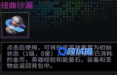 2、扭曲沙漏:用于给未觉醒过的英雄进行重置,重置后英雄恢复到1级,0星的状态,并返还全部消耗的金币,经验和能量石。装备和圣物会返回包裹中。