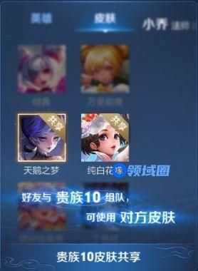 王者荣耀v10共享皮肤什么意思?贵族10的新特权就是可以跟同一个小队中的其他玩家共享自己所拥有的皮肤,让你的好友能不用购买也能使用你的皮肤,这绝对是一个非常不错的特权,很多人也是看上了这一点才想要冲V10的。下面就为大家带来王者荣耀v10共享皮肤介绍。