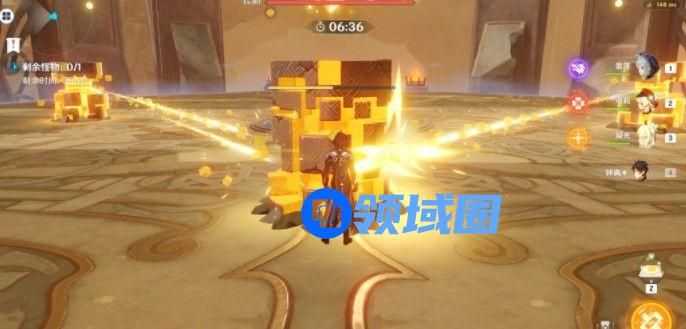 复活柱:在打了几波岩柱子之后,会中间出现三根复活柱。有雷泽的可以留个大,可以一波打掉。这里打岩柱子和伤害没有关系,0级的也可以用。这里是用钟离一个e打掉俩,然后另一个平a掉。