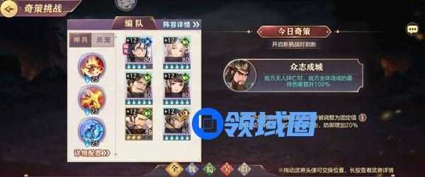 奇策挑战众志成城关卡提供的奇策效果为:我方无人阵亡时,我方全体造成的最终伤害提升100%