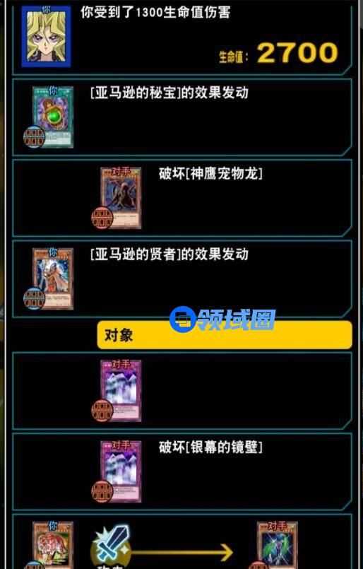 【亚马逊的贤者】攻击【神鹰宠物龙】,(【神鹰宠物龙】因【亚马逊的秘宝】效果被破坏),【亚马逊的贤者】连锁效果破坏【银幕的镜壁】;