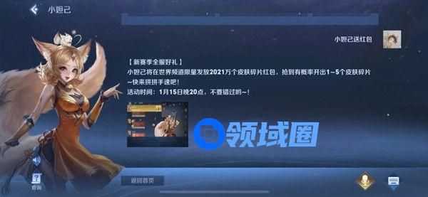新赛季好礼,全服限量发放500万个皮肤碎片红包,抢到有概率开出1~5个皮肤碎片~快来拼拼手速吧!