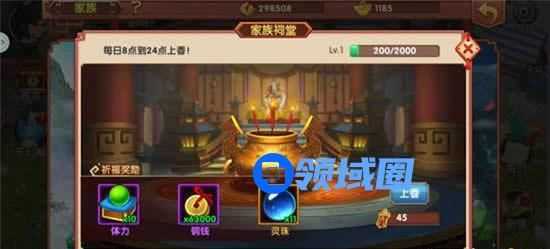 家族祠堂是族员们上香祈福的地方,每天在固定时间内祈愿可以获得一定的物品奖励,例如铜钱、体力和灵珠。每日上香奖励有份额限制,一人每天只能进行一次上香,僧多肉少,大侠们一定要切记每天来家族祠堂祈福领肉噢!