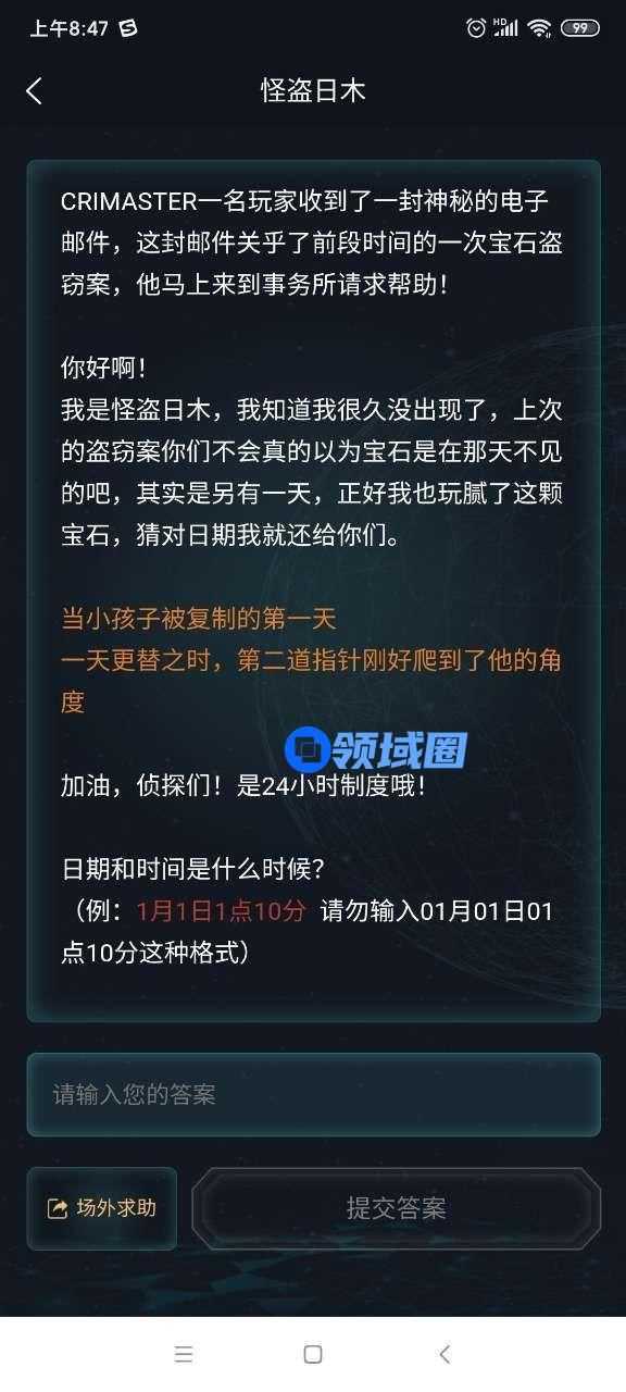 我是怪盗日木,我知道我很久没出现了,上次的盗窃案你们不会真的以为宝石是在那天不见的吧,其实是另有一天,正好我也玩腻了这颗宝石,猜对日期我就还给你们。