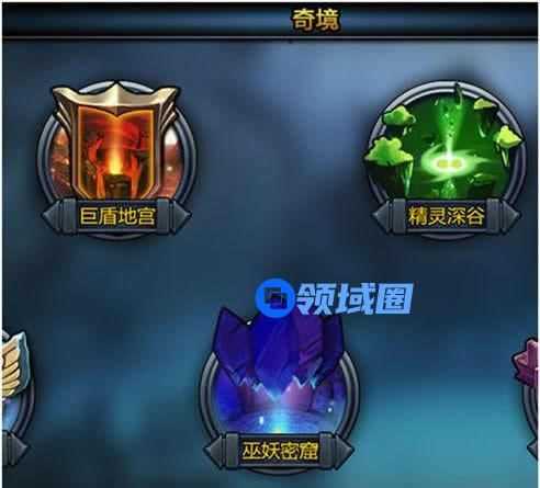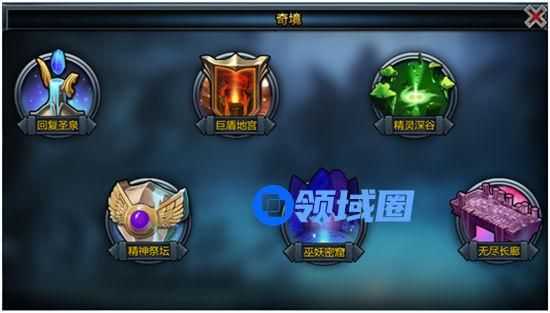 奇境分为以下几个板块:无尽长廊、战神山、回复圣泉、巨盾地宫、巫妖密窟、精灵深谷、精神祭坛,接下来为大家详细介绍各个板块的功能