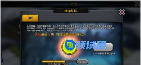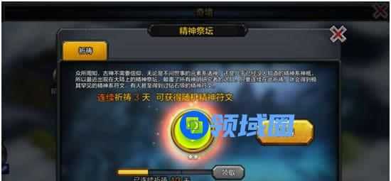精神祭坛每天只可以祈祷一次,祈祷进度条满后,可以随机获得精神符文奖励,进度条未满的情况下,中断祈祷,那么祈祷进度条则会清零。每天0:00进行刷新。