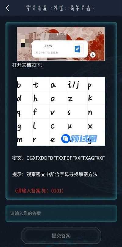 提示:观察密文中所含字母寻找解密方法(请输入答案如:0101)