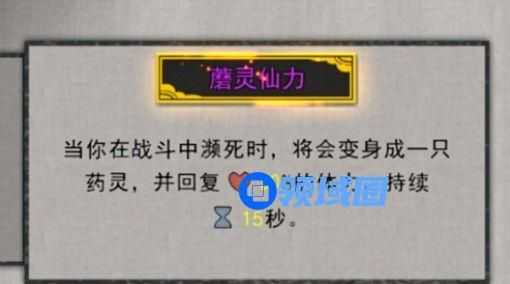 拥有蘑菇之力的前提条件下,天道筑基突破后就会出现【蘑灵仙力】,效果是:当你在战斗中濒死时,将会变身为一只药灵,并且回复30%的体力,出现15秒。(PS:后面可升级为蘑灵神力,恢复血量更高)。
