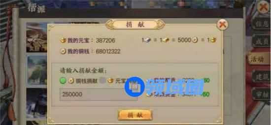 提升帮贡和帮派资产的最直接办法就是捐献,成员通过捐献铜钱和元宝获得。