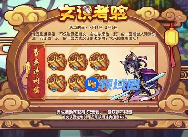 他是乱世枭雄,不仅能武还能文,自古以来他“武”的一面都被世人津津乐道,那对于他“文”的一面,大家又了解多少呢?快来接受考验吧!完成活动即可获得宠物:曹丕子桓。