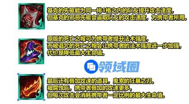 这次官方也是放出了一些黑暗武器的属性,比如说基克的先驱、帽子、羊刀等等。其中基克的先驱本来是提升队友的攻速,但在变成黑暗武器之后,却会偷取队友的攻速,来增加给携带者。帽子的话会增加