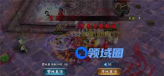在帮派会战中死亡后,有两种复活选项。一为返回营地复活,复活有倒计时。需要注意的是,复活是随机在4个营地中的一个复活。而为原地复活,需要消耗50蓝钻。(信春哥原地复活)当然,在进入帮派会战和复活时,都有3秒的保护时间。避免腿还没站直就又跪下的惨剧。