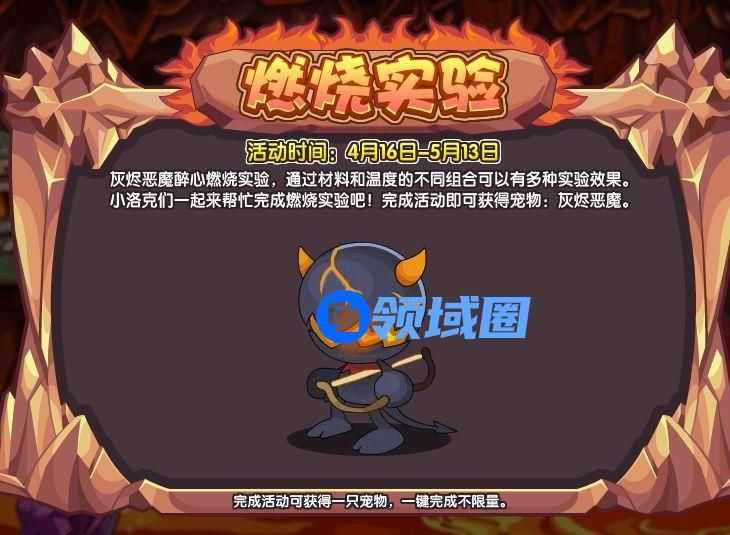 再来看看另外一边,灰烬恶魔近来醉心燃烧实验,通过材料和温度的不同组合能获得不同燃烧结果。小洛克们一起来帮忙完成实验吧!完成活动即可获得宠物:灰烬恶魔!同时相关进化活动也在开启中!千万不要错过啦!