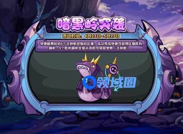 突袭暗黑岭的5个古钟蛇控制的区域,成功完成突袭可获得区域胜利旗帜,5个胜利旗帜全部点亮即可领取宠物“古钟蛇”。