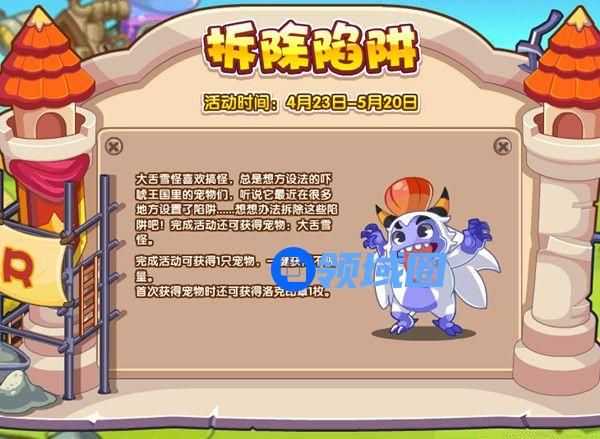 大舌雪怪喜欢搞怪,总在想方设法的吓唬王国里的宠物们,听说它最近在很多地方设置了陷阱……想想办法拆除这些陷阱吧!完成活动还可获得宠物:大舌雪怪。