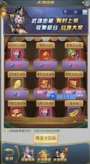 而玩家挑战教皇传奇活动获得的武魂积分,则可以在活动商店武魂秘藏中兑换包括秘法淬火内丹、魂兽内丹、魂核选择宝箱、专属觉醒宝箱等等丰富的奖励。