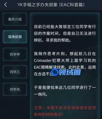 我稍作思考片刻,想起前几日在Crimaster犯罪大师上面学习到的EAC眼睛解读线索。此时此景, 运用在合适不过。