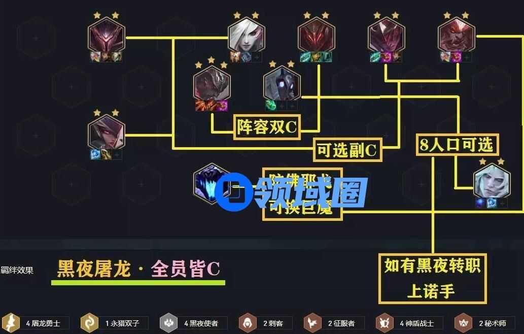 阵容运营关键羁绊:4黑夜+4屠龙。阵容双C亚索、铁男。
