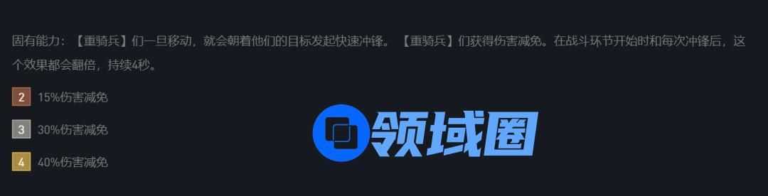 也许有小伙伴就会问了,那么我开局把重骑丢在后面岂不是开局就能够获得双倍加成,岂不是美滋滋?哎,就喜欢这样的小机灵鬼。但是需要注意的是重骑会在冲锋和开局时减伤翻倍,但不叠加,所以人马和芮尔放在第一排即可,免得对方站位针对人马。