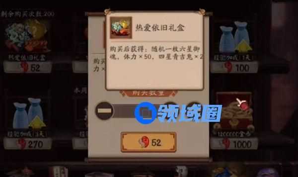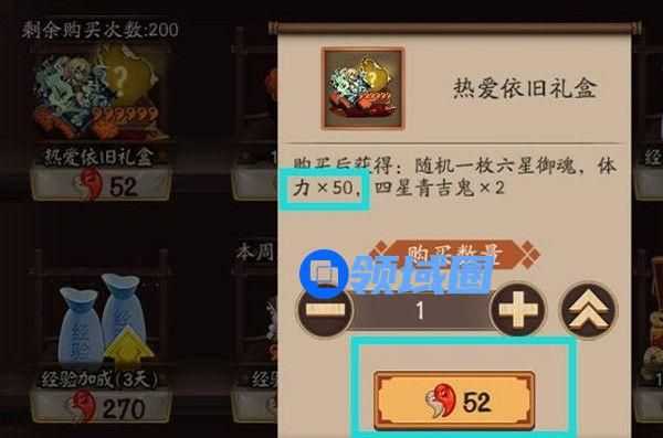 购买后获得:随机六星御魂×1,体力×50,四星青吉鬼×2