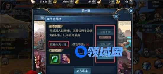 点击所指图标可进入“副本”,进行“副本”任务时,需要消耗一定的体力值。